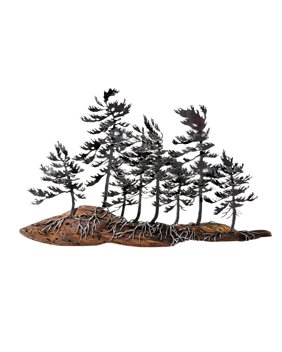 This truly one-of-a-kind windswept pine sculpture is individually hand cut from steel and then carefully intertwined with this unique piece of Canadian hardwood. Married together, the two create a image and feeling that is truly Canadian. This piece features 8 stunning trees mounted on maple.