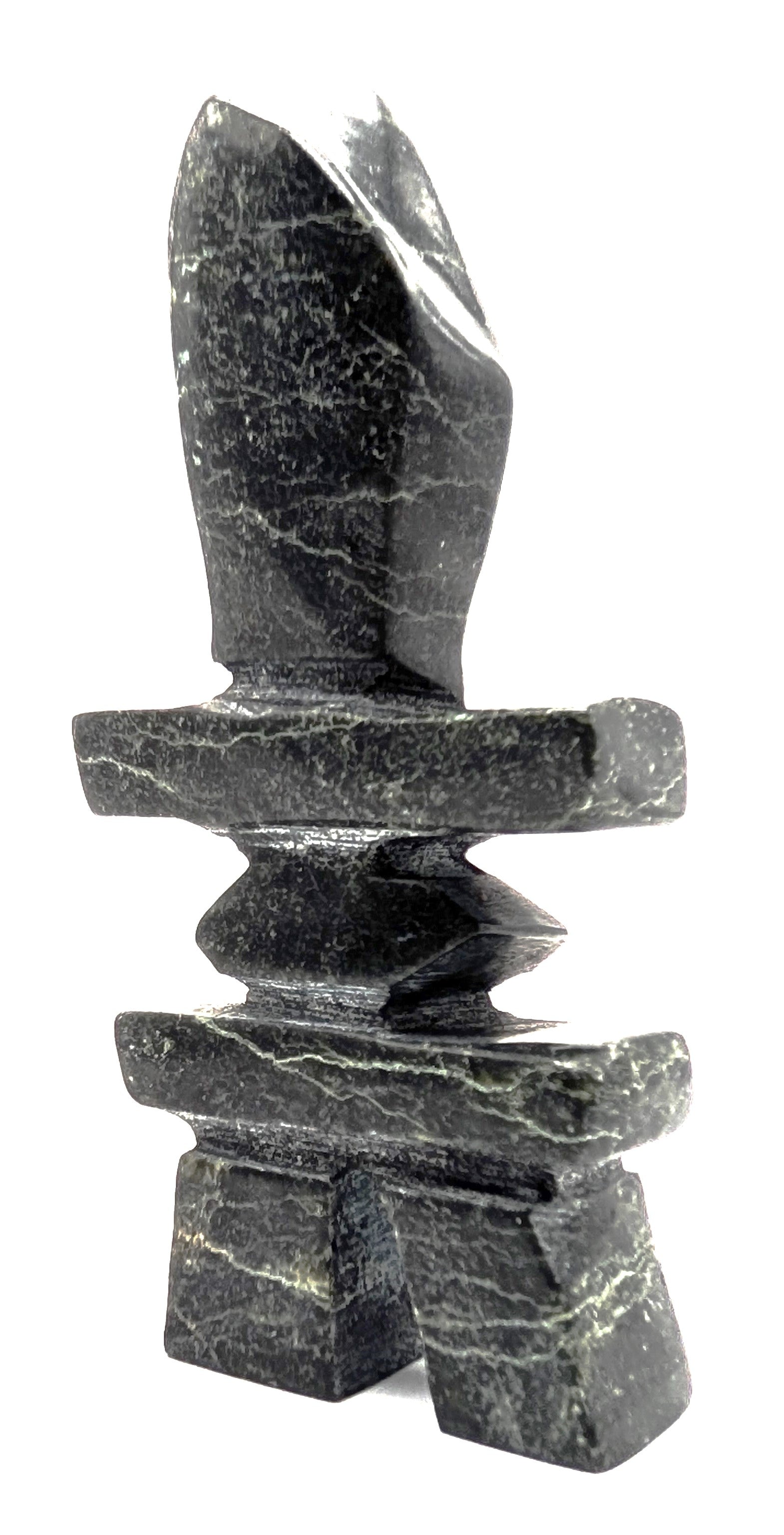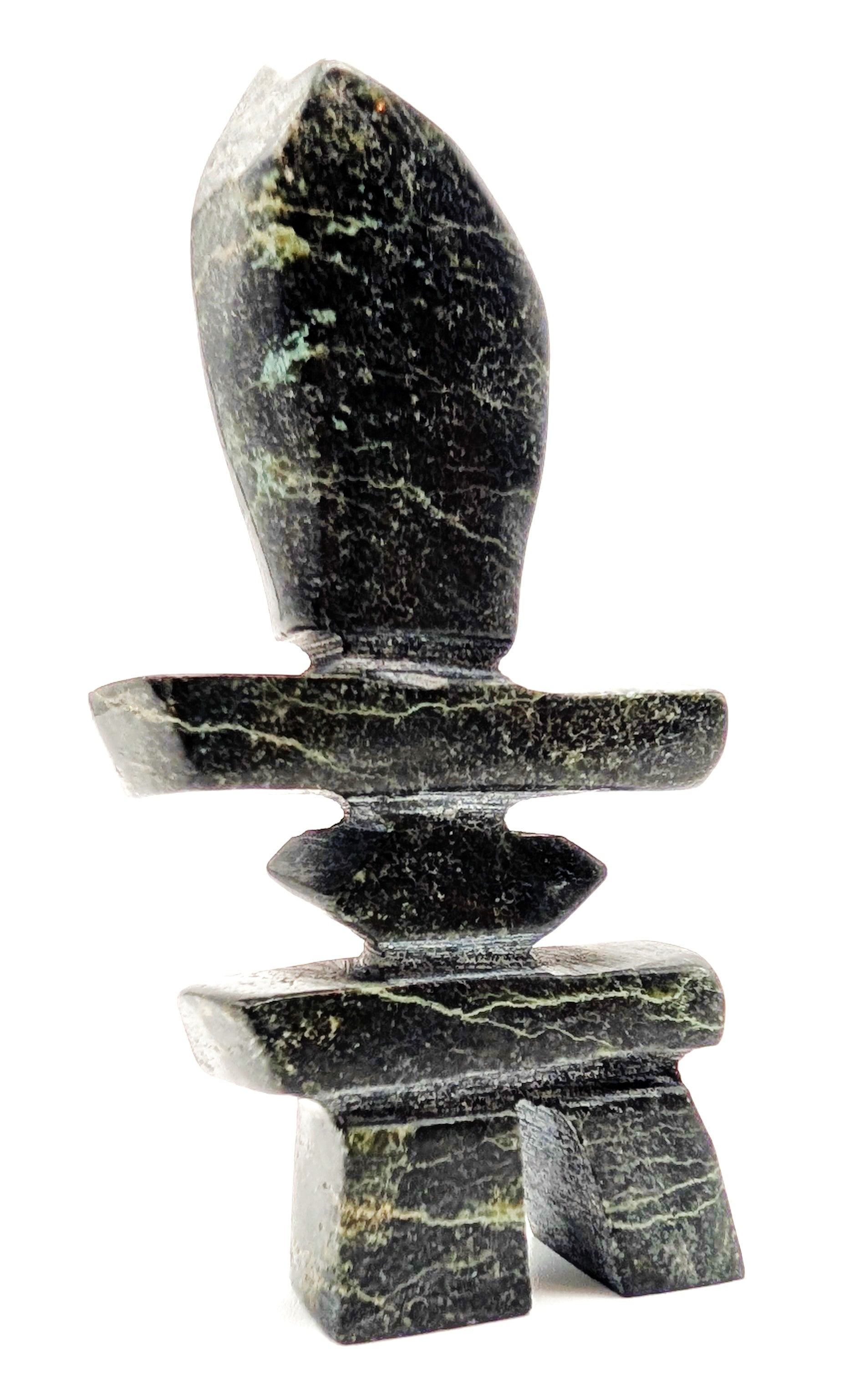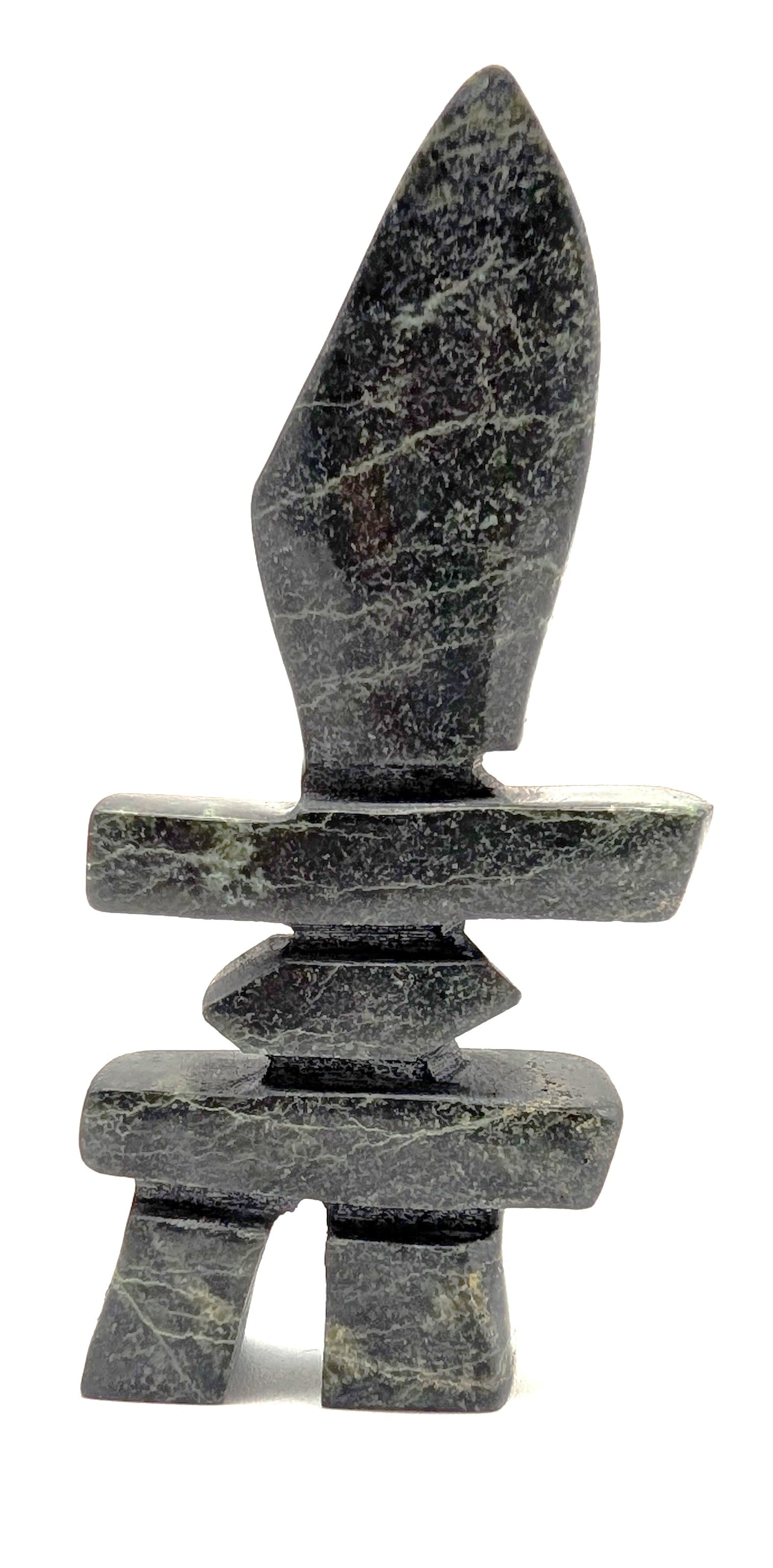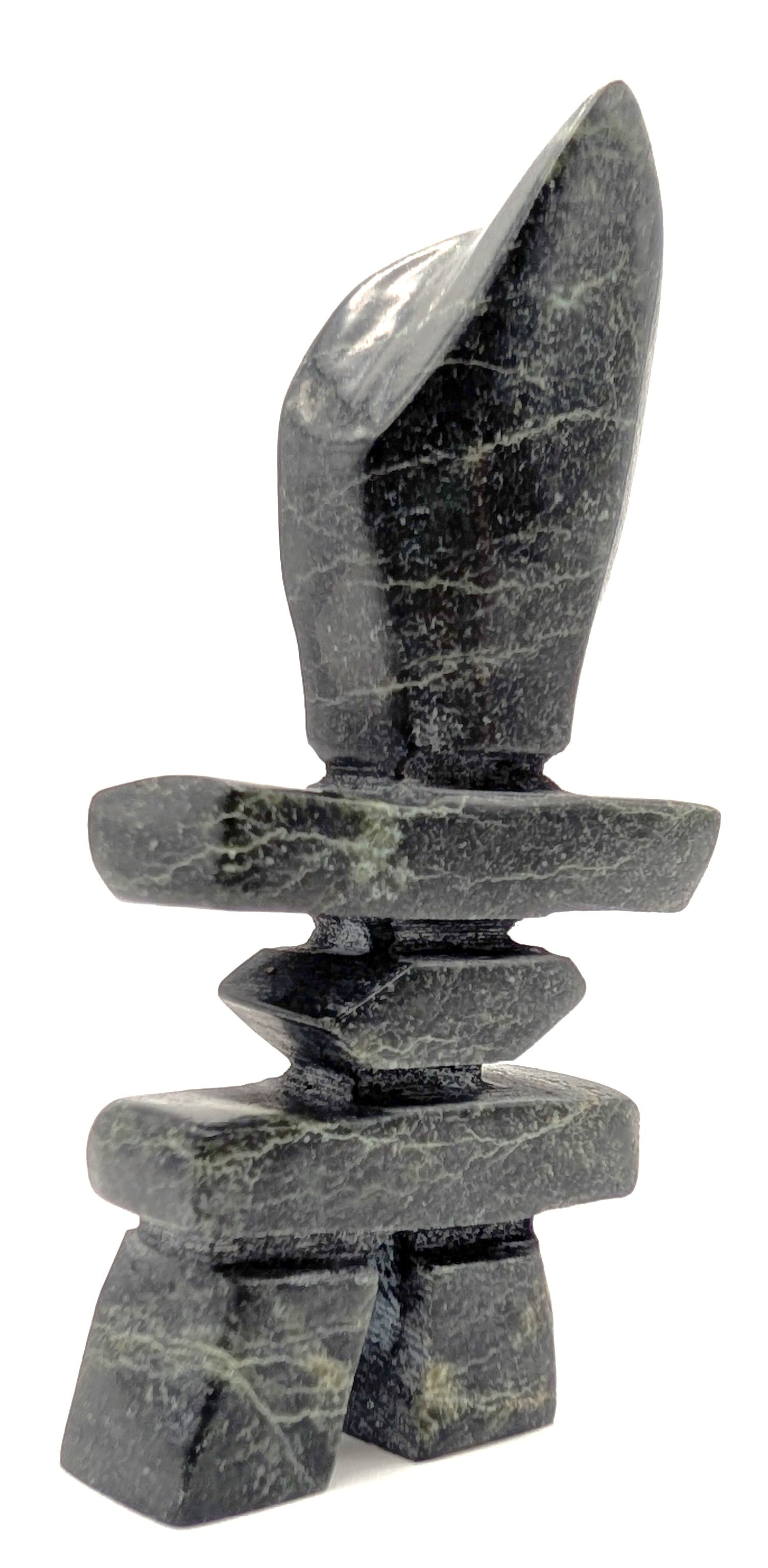 This "Inukshuk" soapstone carving was created by Inuk artist Kuzy Curley from Kinngait, Cape Dorset, Nunavut.