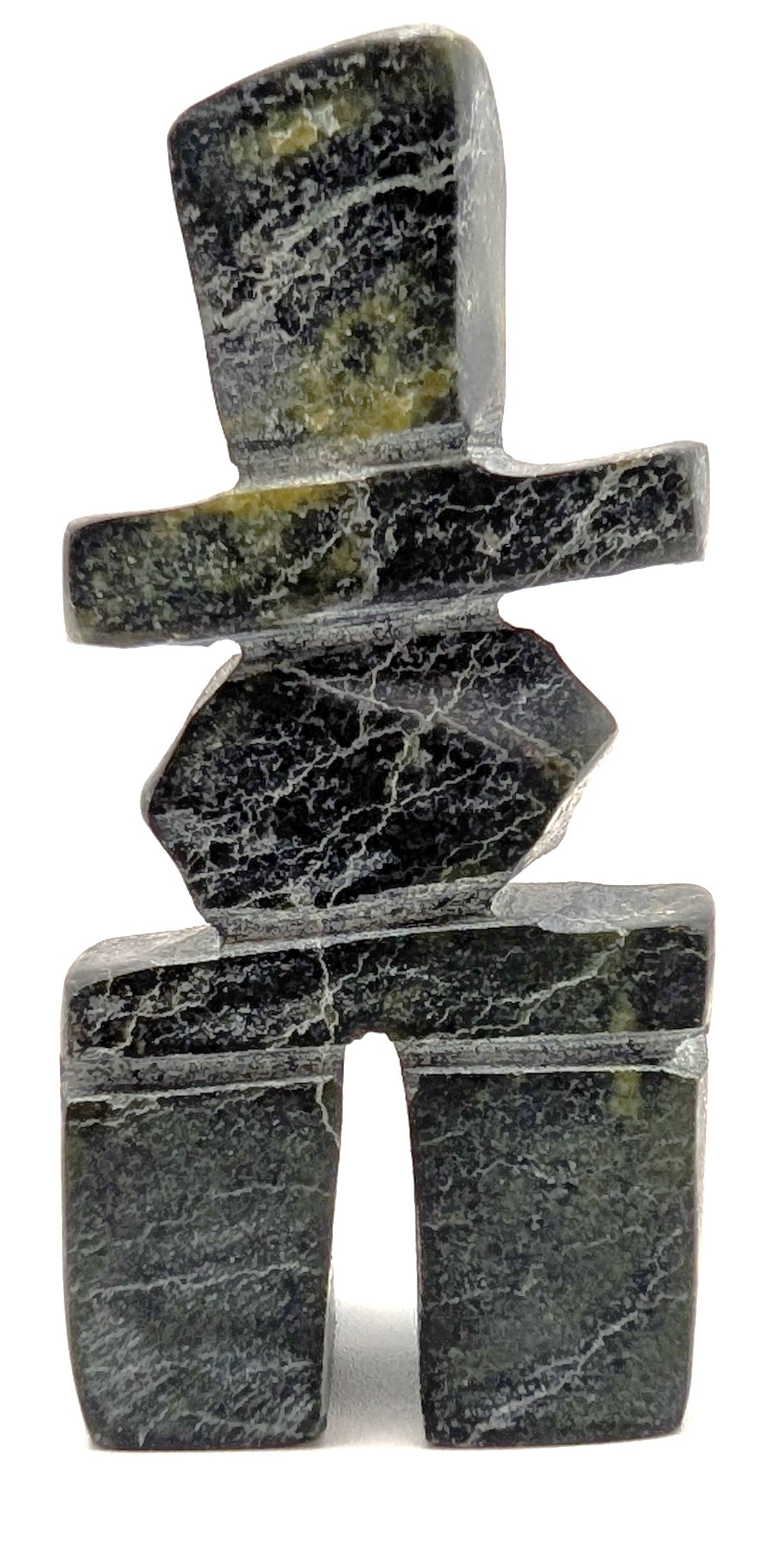 This "Inukshuk" soapstone carving was created by Inuk artist Kuzy Curley from Kinngait, Cape Dorset, Nunavut.