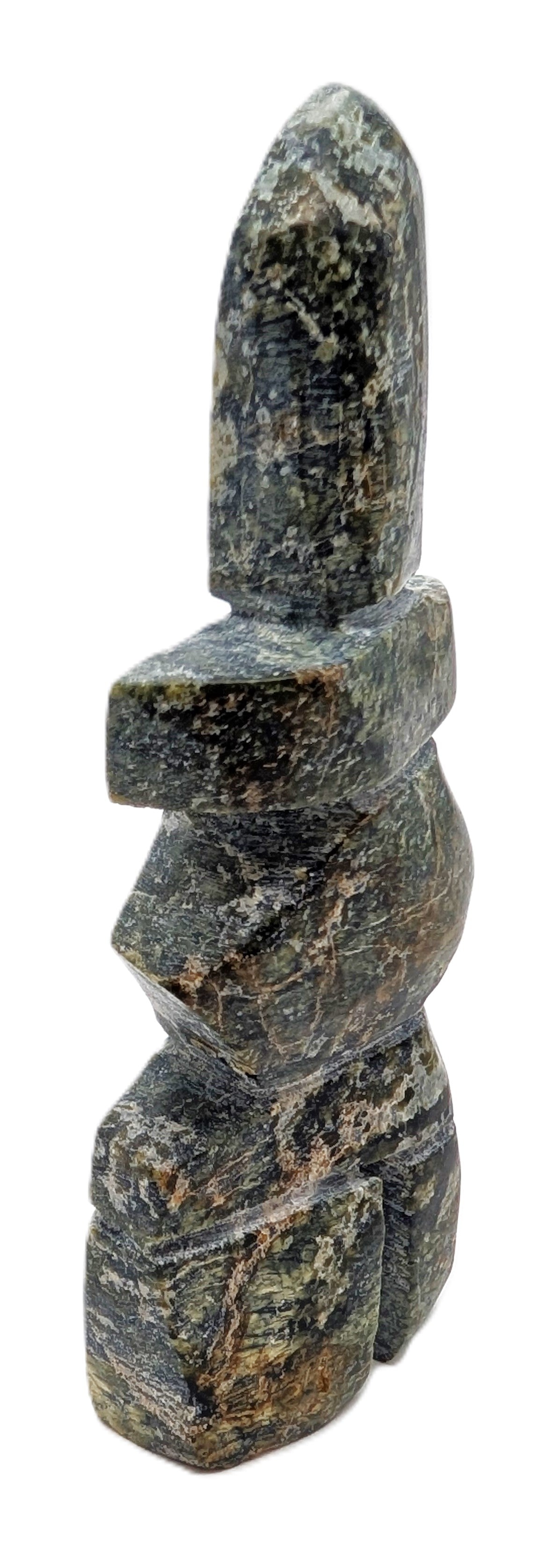 This "Inukshuk" soapstone carving was created by Inuk artist Kuzy Curley from Kinngait, Cape Dorset, Nunavut.