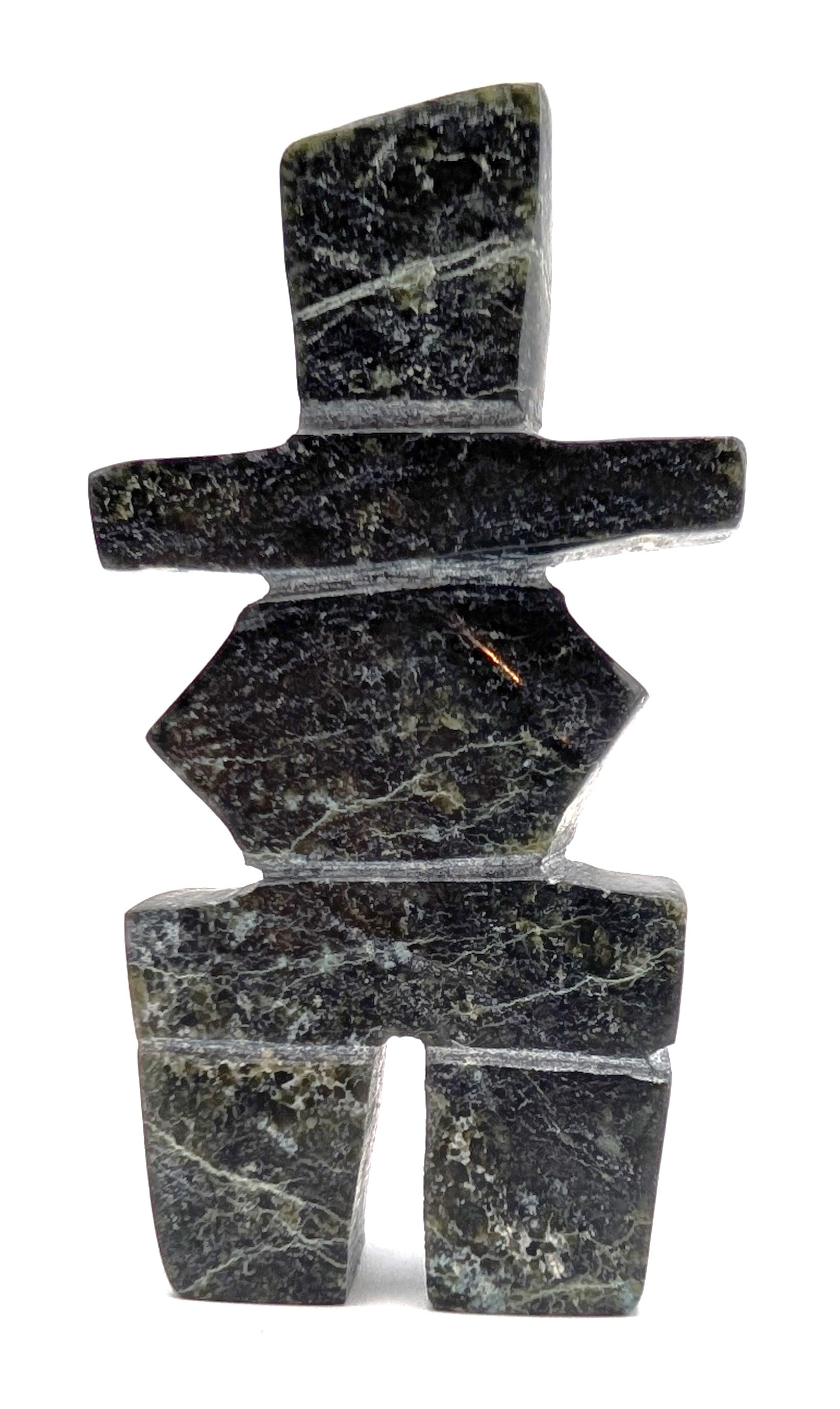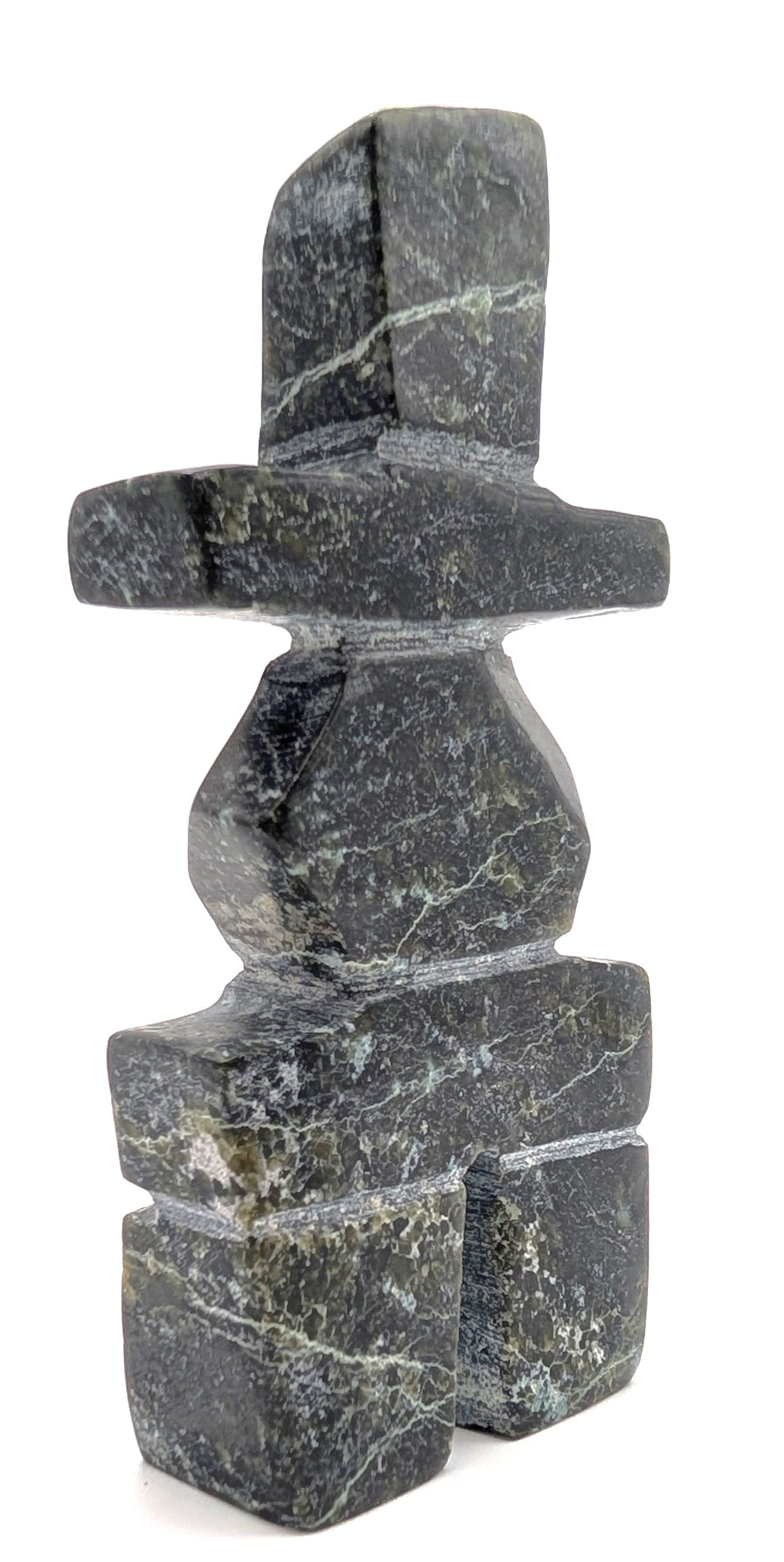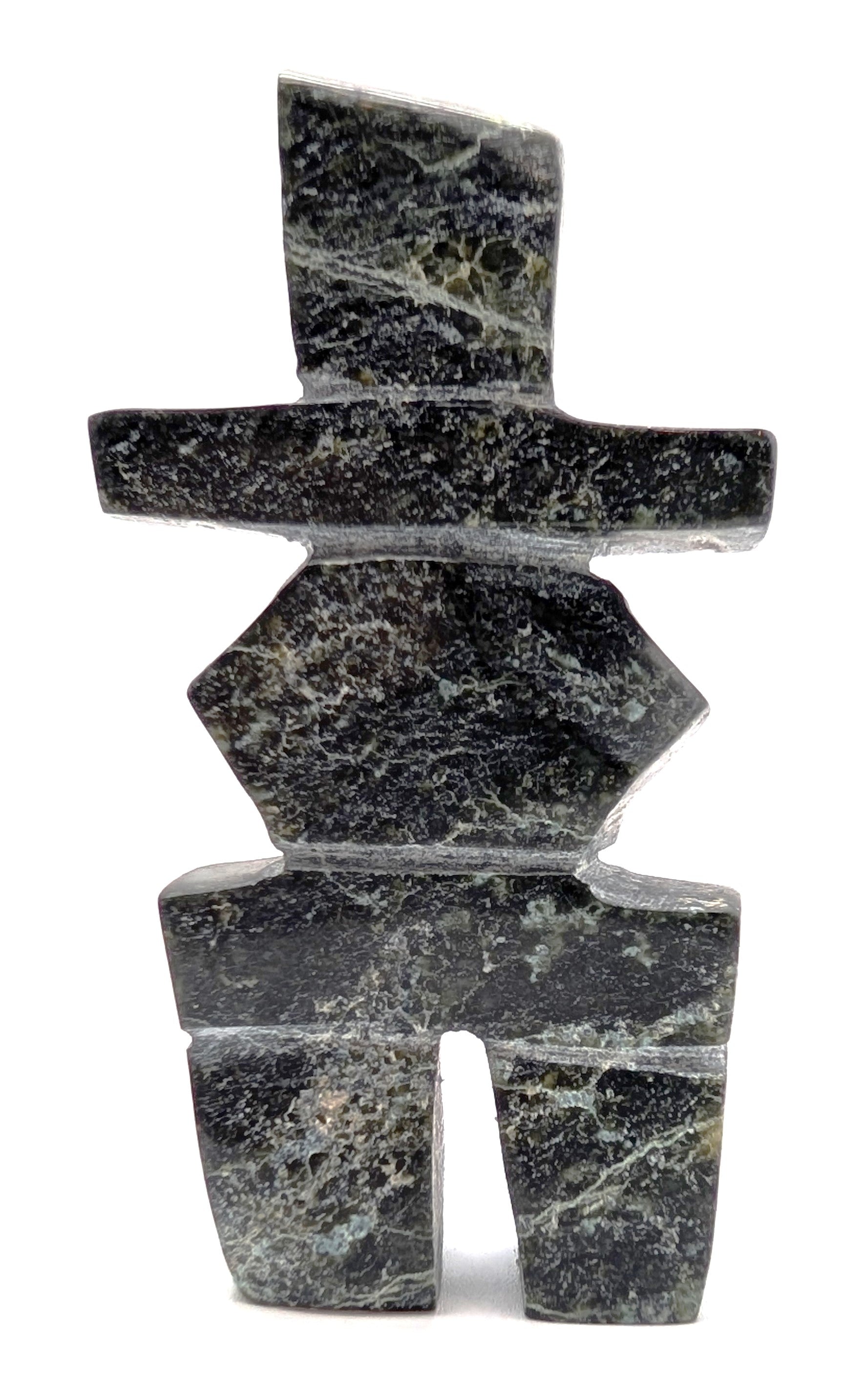 This "Inukshuk" soapstone carving was created by Inuk artist Kuzy Curley from Kinngait, Cape Dorset, Nunavut.