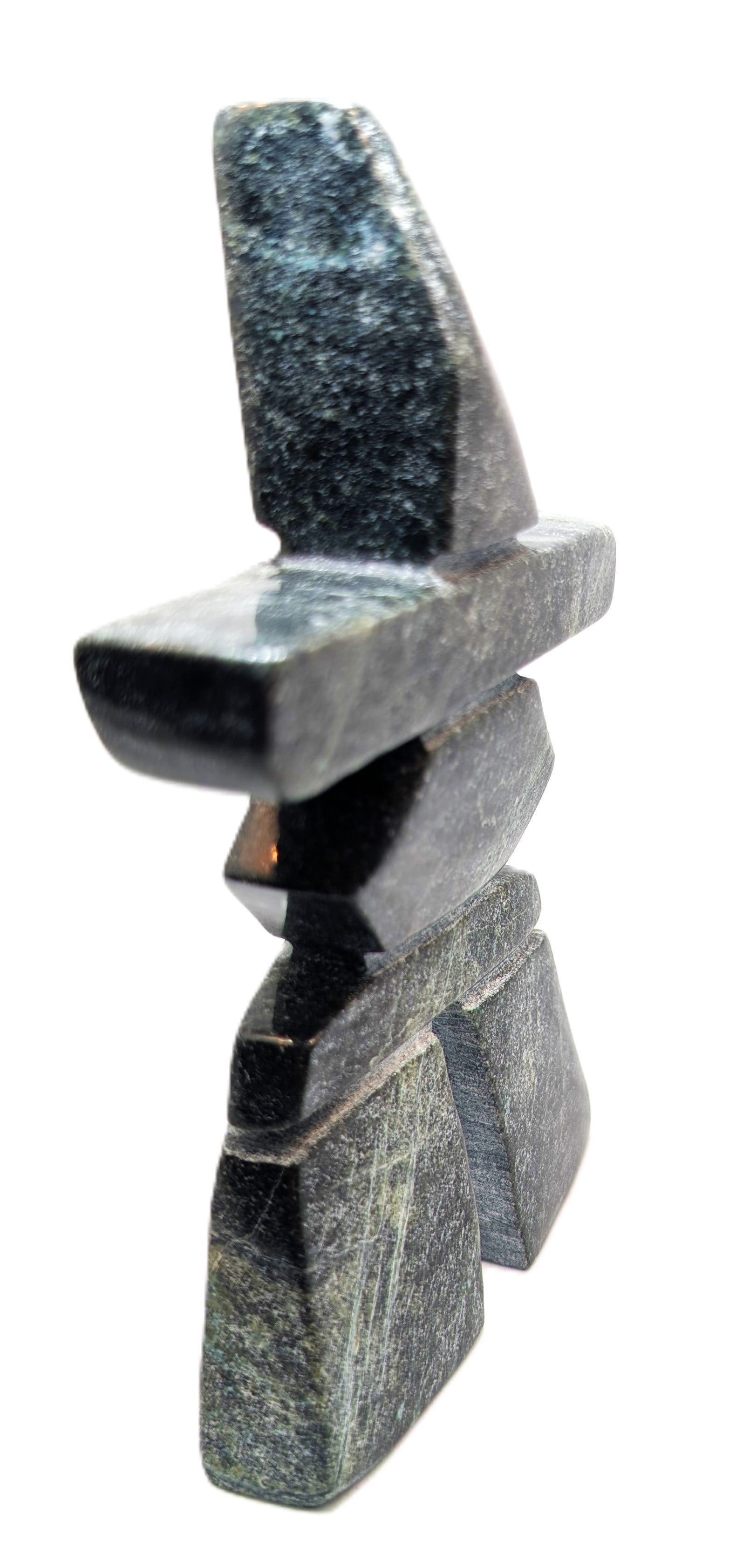 This "Inukshuk" soapstone carving was created by Inuk artist Kuzy Curley from Kinngait, Cape Dorset, Nunavut.