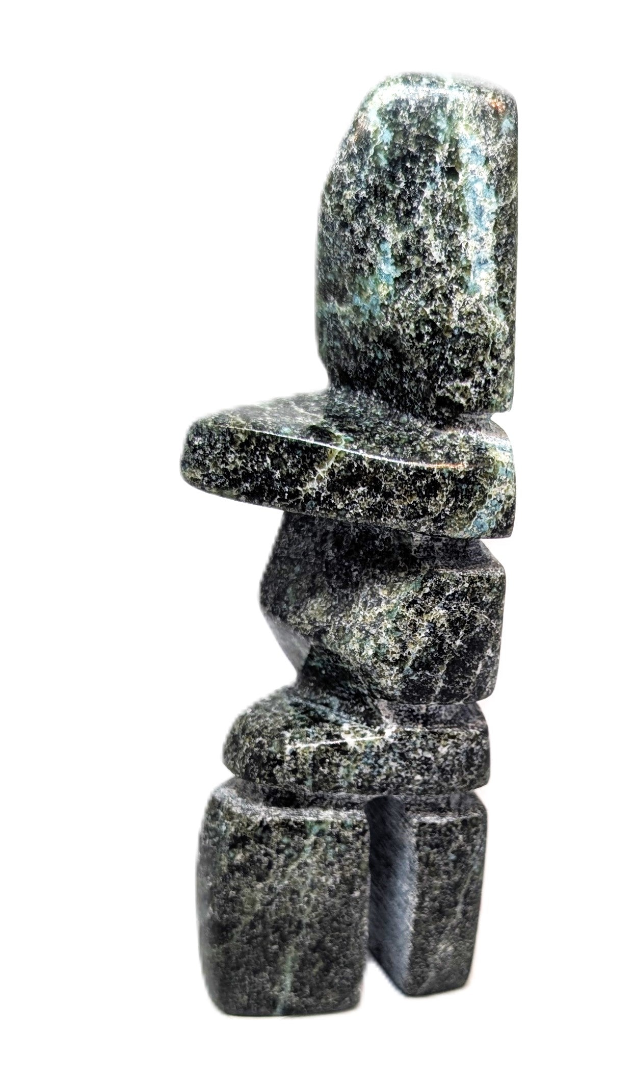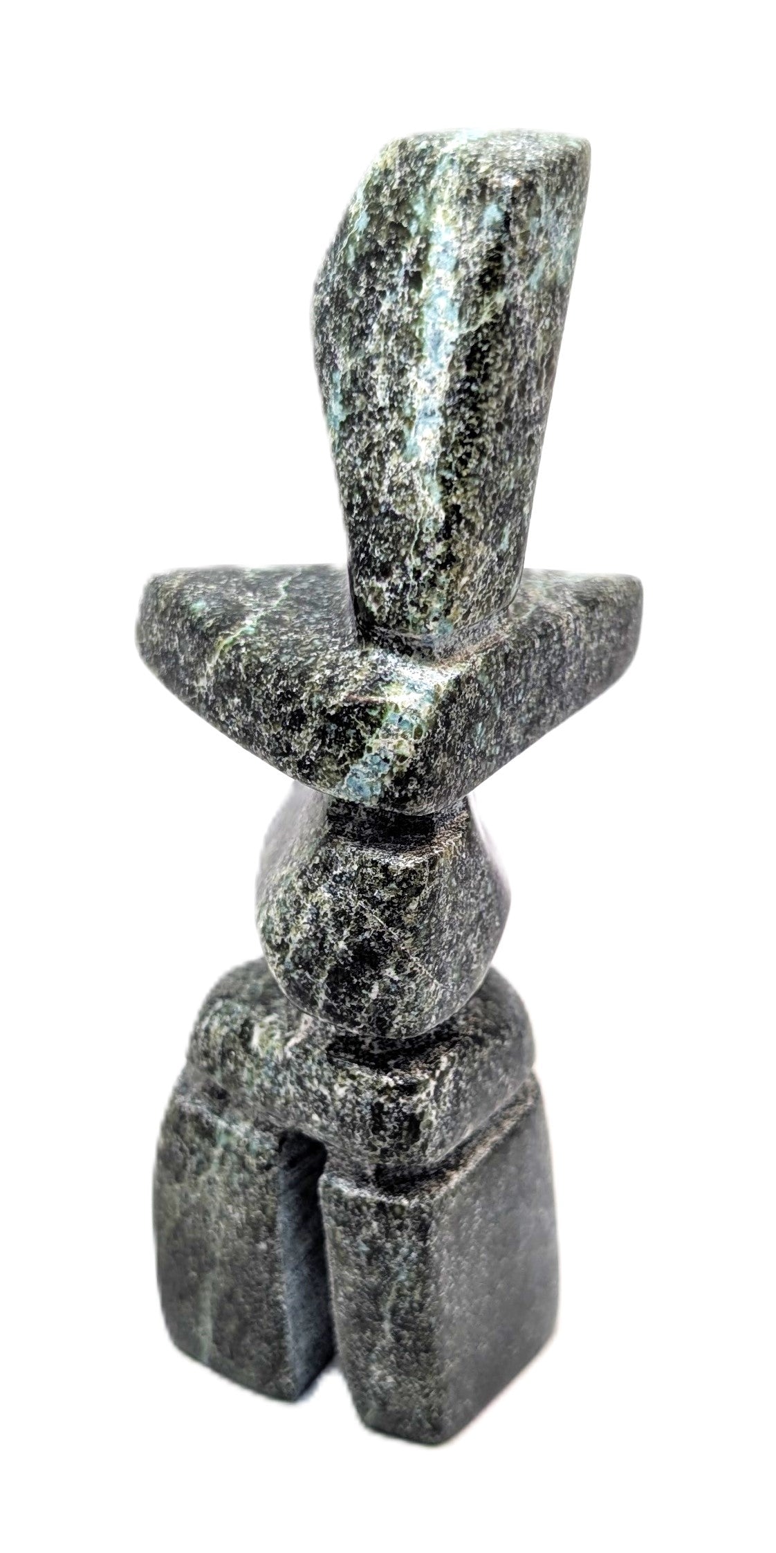 This "Inukshuk" soapstone carving was created by Inuk artist Kuzy Curley from Kinngait, Cape Dorset, Nunavut.