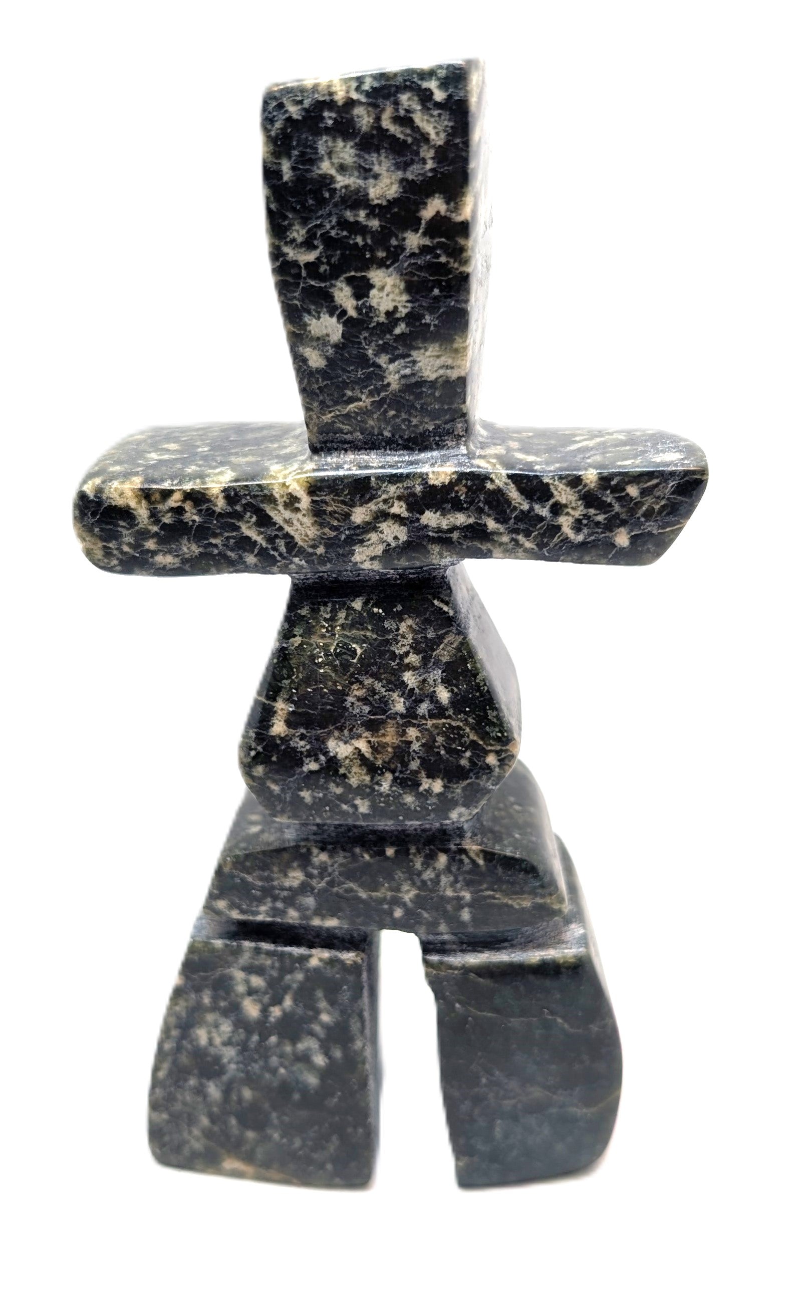 This "Inukshuk" soapstone carving was created by Inuk artist Kuzy Curley from Kinngait, Cape Dorset, Nunavut.