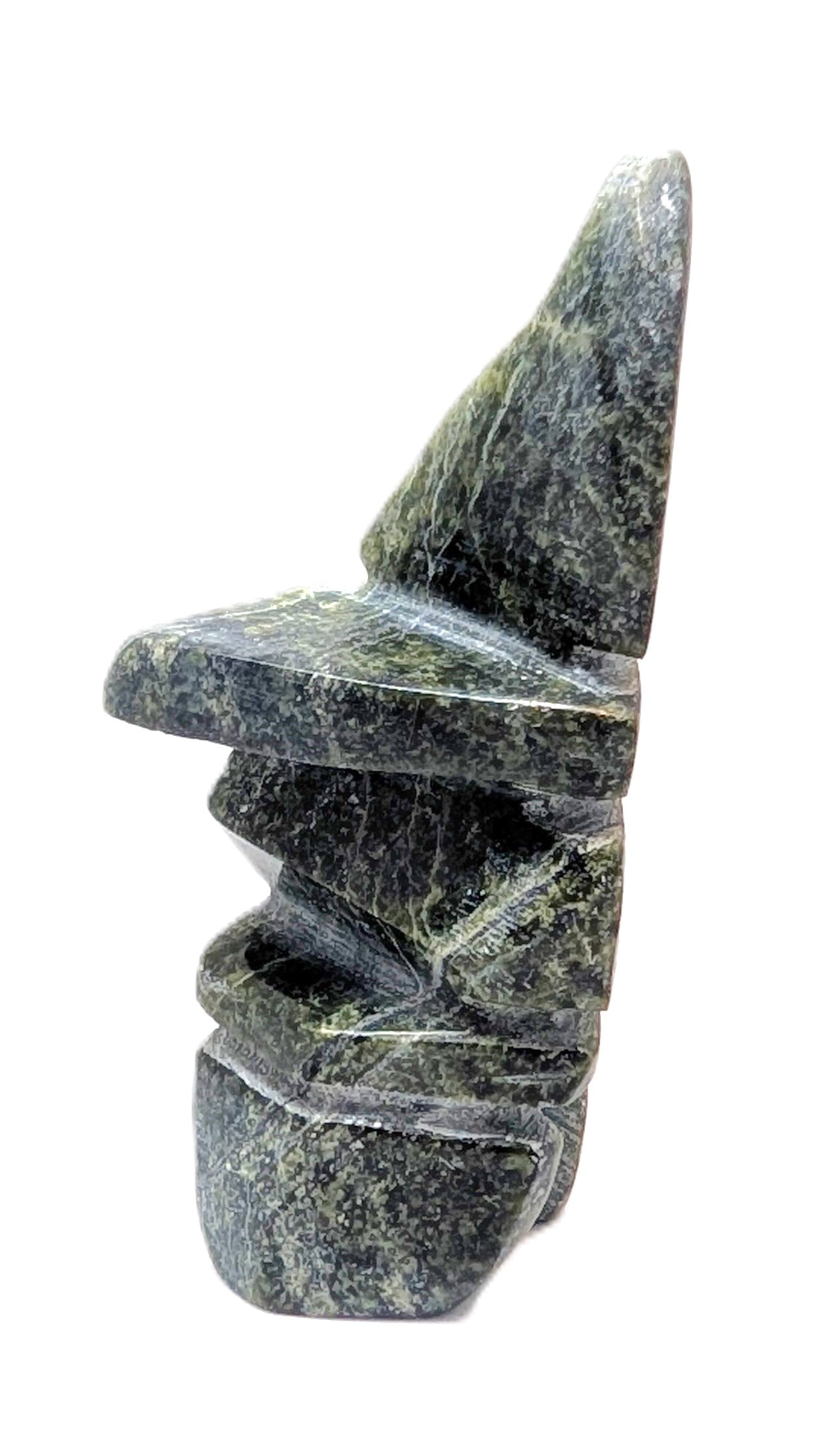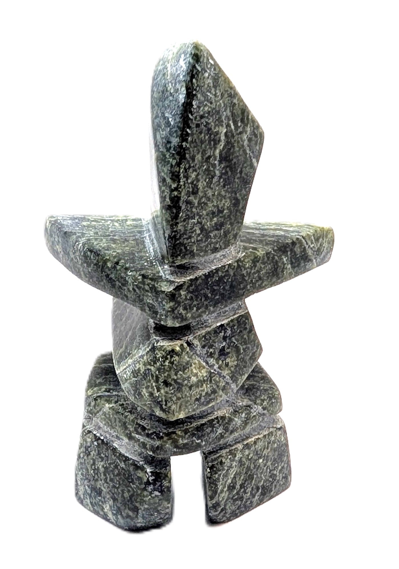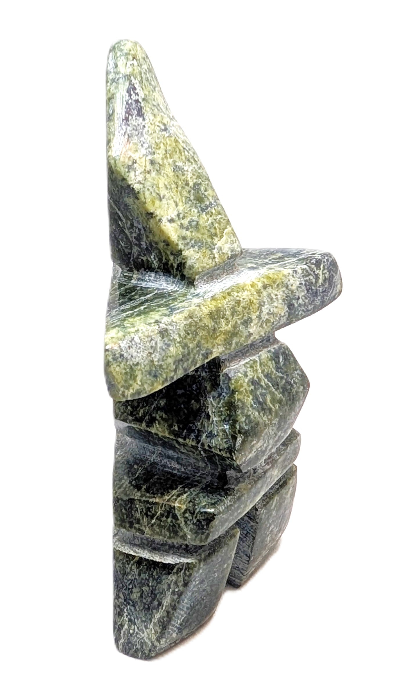 This "Inukshuk" soapstone carving was created by Inuk artist Kuzy Curley from Kinngait, Cape Dorset, Nunavut.