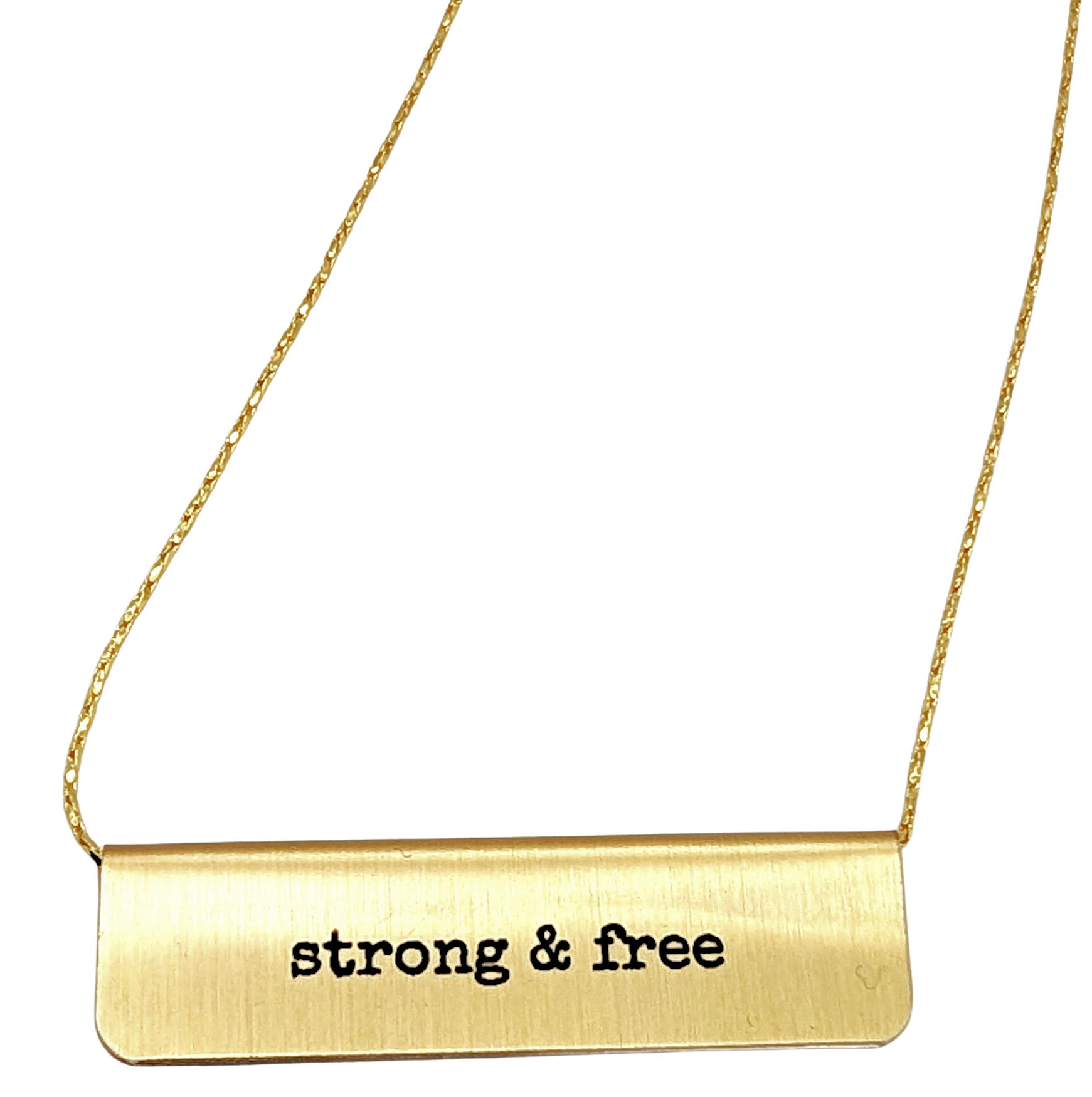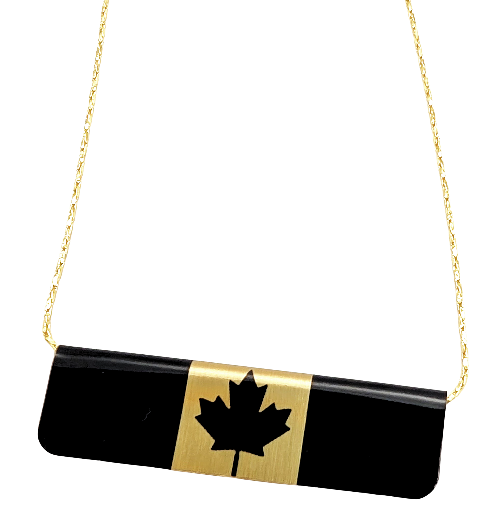 Our flag necklace features a black and white Canada flag. Made from recycled trophy metal with an 18" hypoallergenic chain and 1.5" extender. Choose to let your flag wave or turn the necklace around to proudly display the engraved "strong & free"