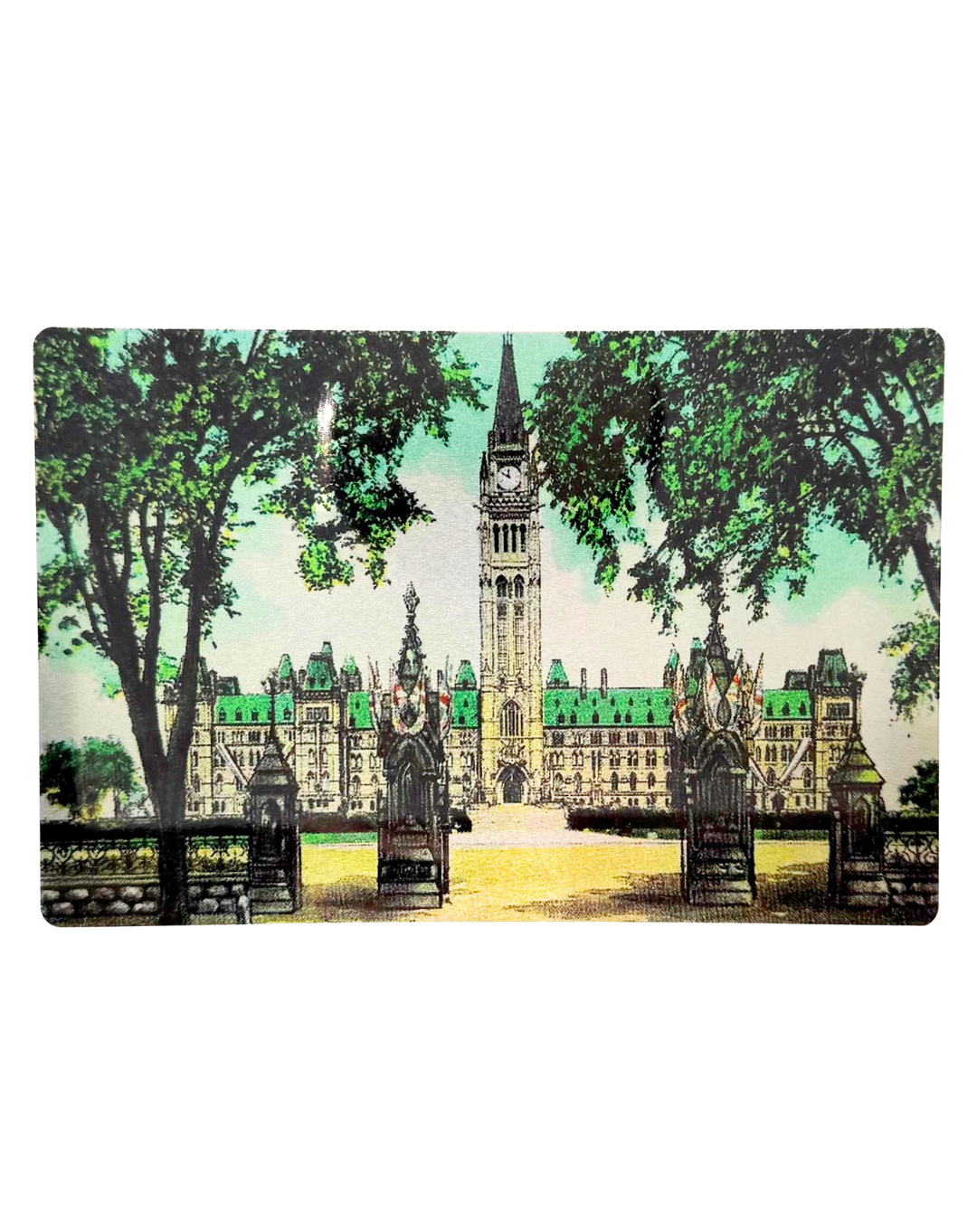 This Canadian-made postcard features Parliament hill above the Rideau river.
