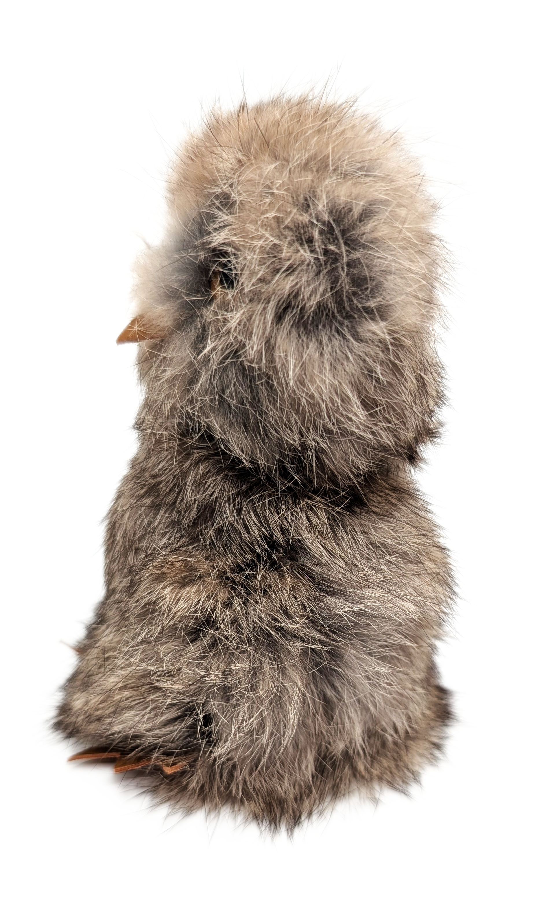 The Inuit have crafted Ookpik (plush toy owls) since the 1960s as souvenirs and gifts, to the delight of children and adults alike. Ookpik may be crafted of sealskin, wolf hide, or rabbit fur. This gentle Ookpik was handcrafted from sealskin fur by Inuk artist Daisy Savard in Quaqtaq, Nunavik. Registration #A99-31735