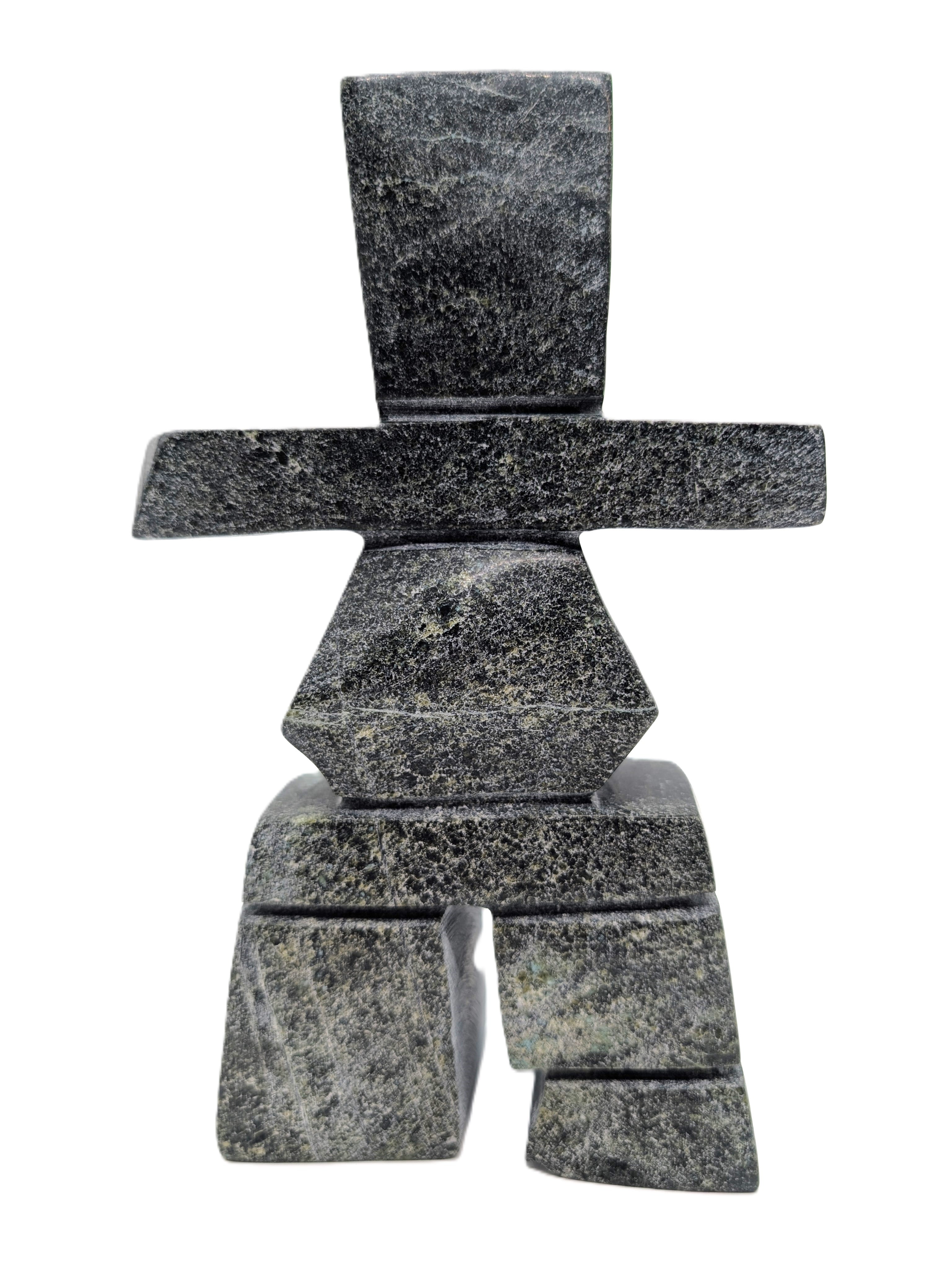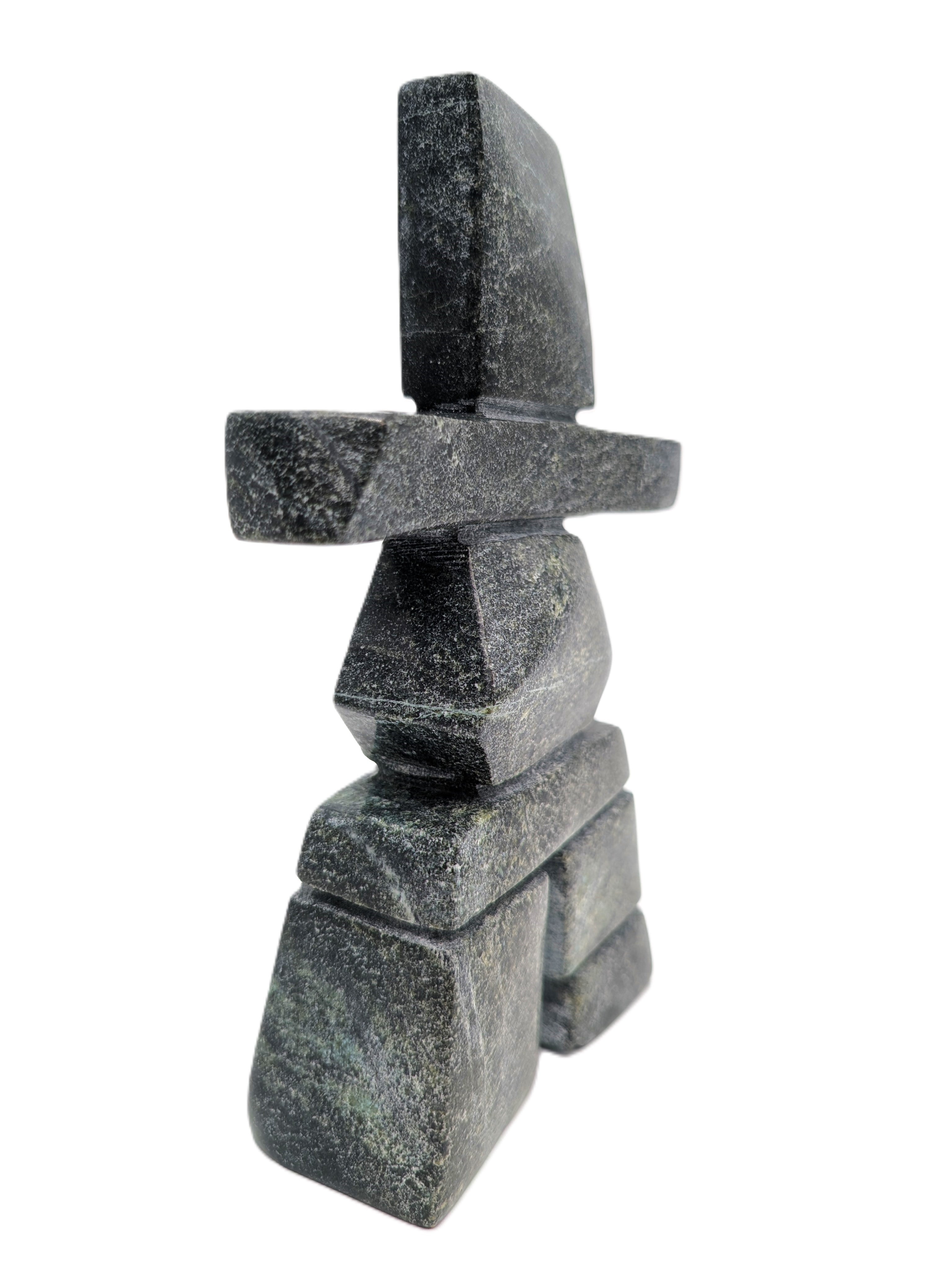This "Inukshuk" soapstone carving was created by Inuk artist Kuzy Curley from Kinngait, Cape Dorset, Nunavut.