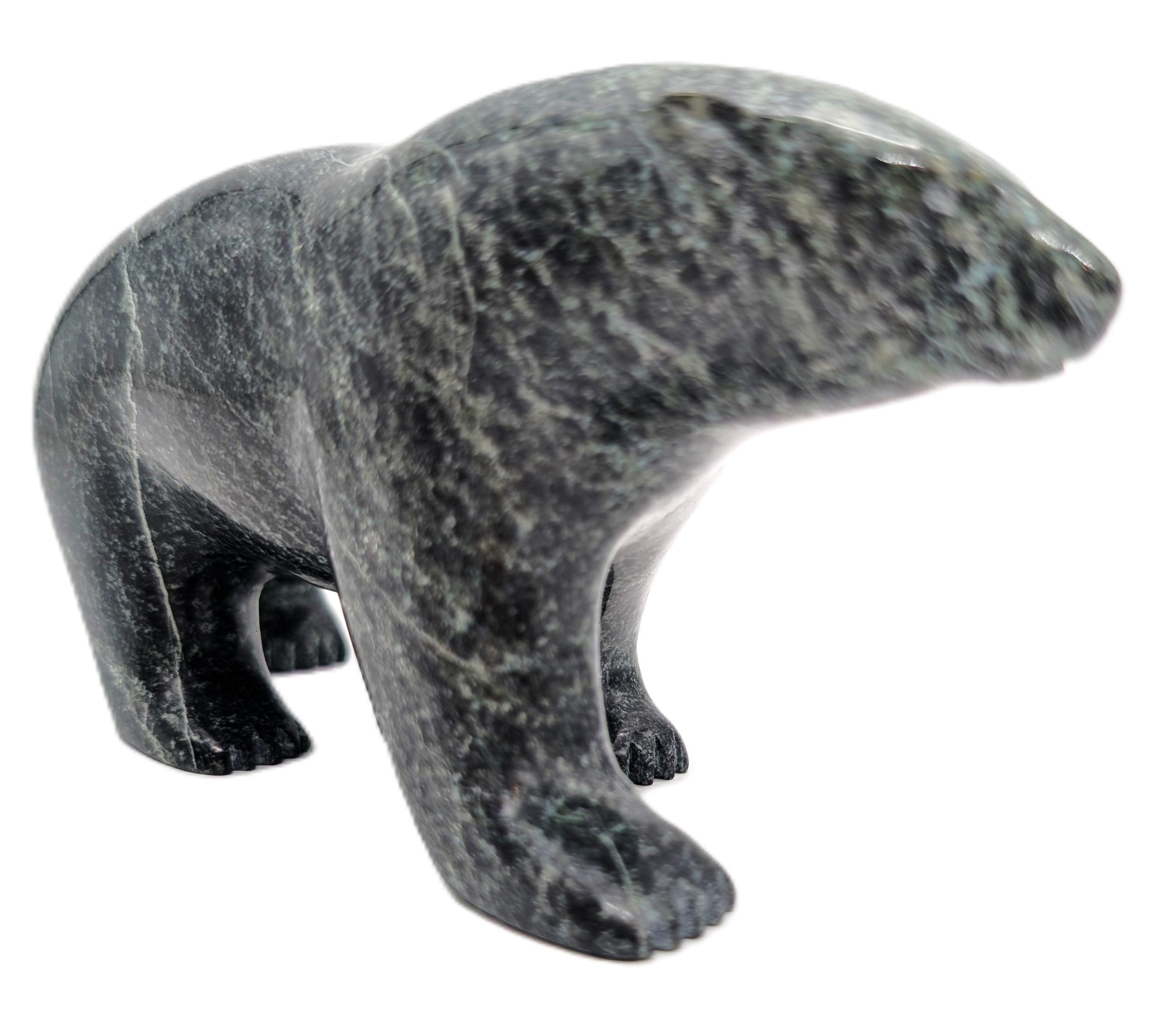 This "Walking Bear" soapstone carving was created by Inuk artist Johnny Saggiak in Cape Dorset, Nunavut. Registration number is 113639.
