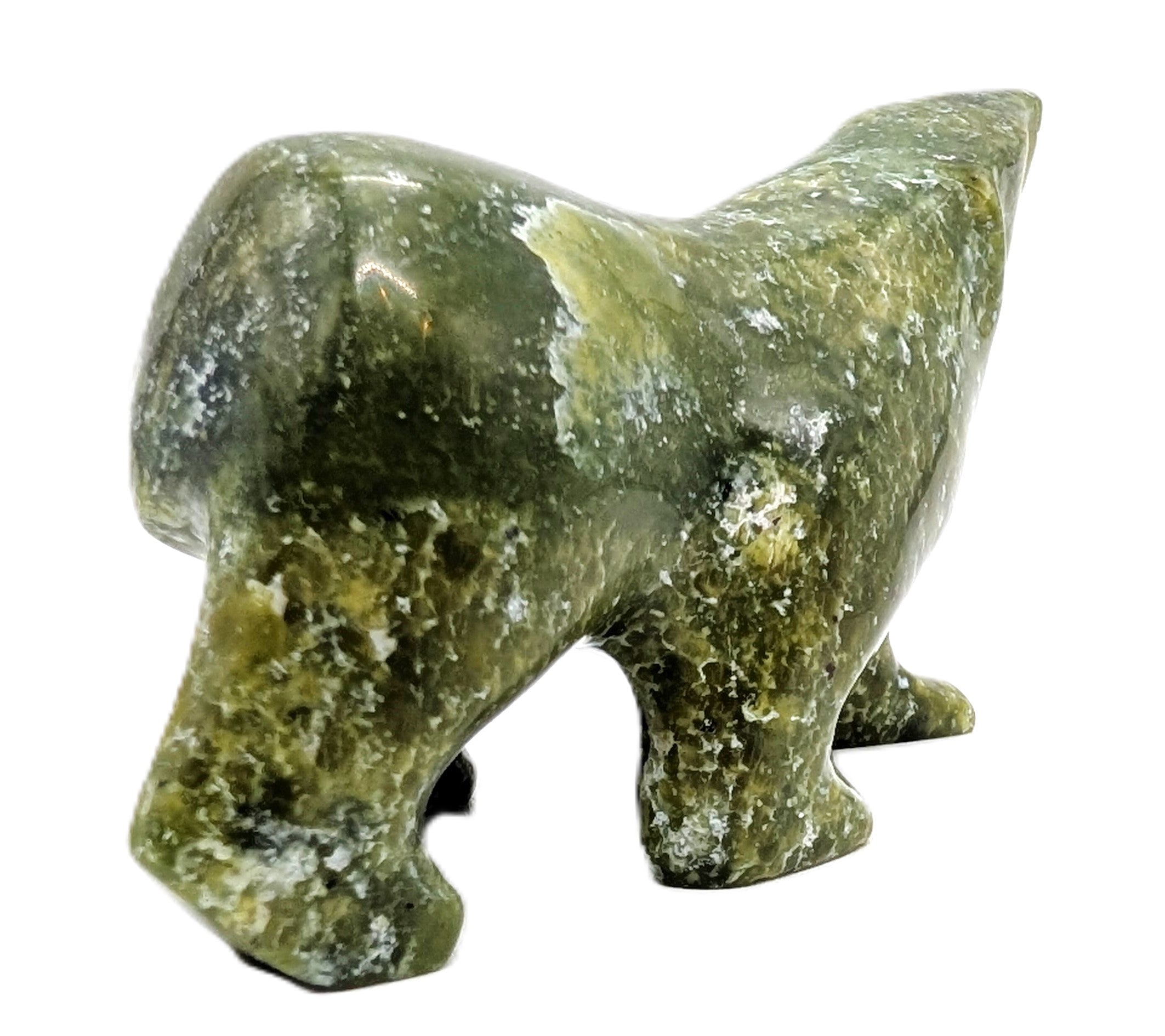 This "Walking Bear" soapstone carving was created by Inuk artist Malitu Akesuk in Cape Dorset, Nunavut. Registration number is 113647.