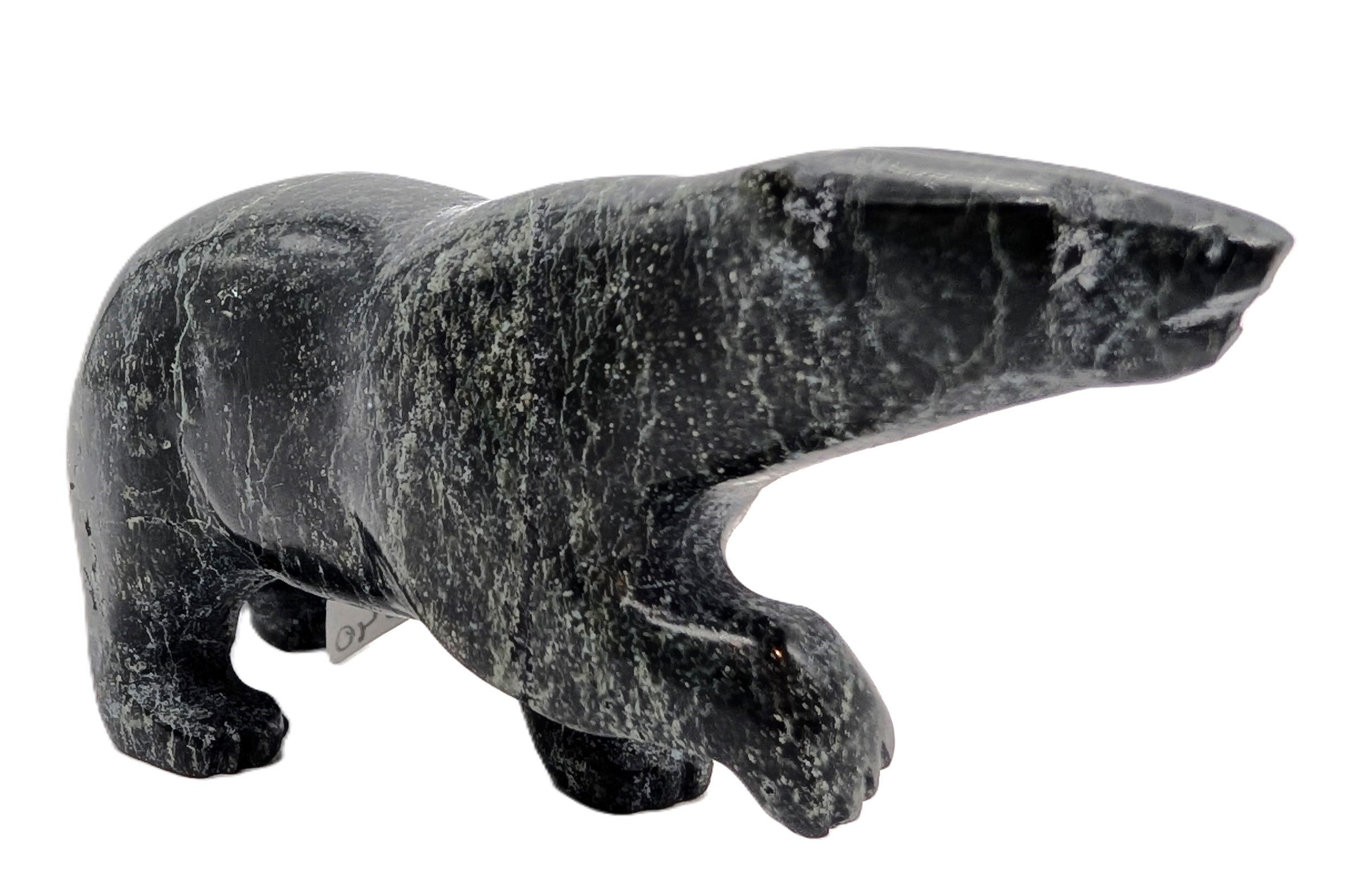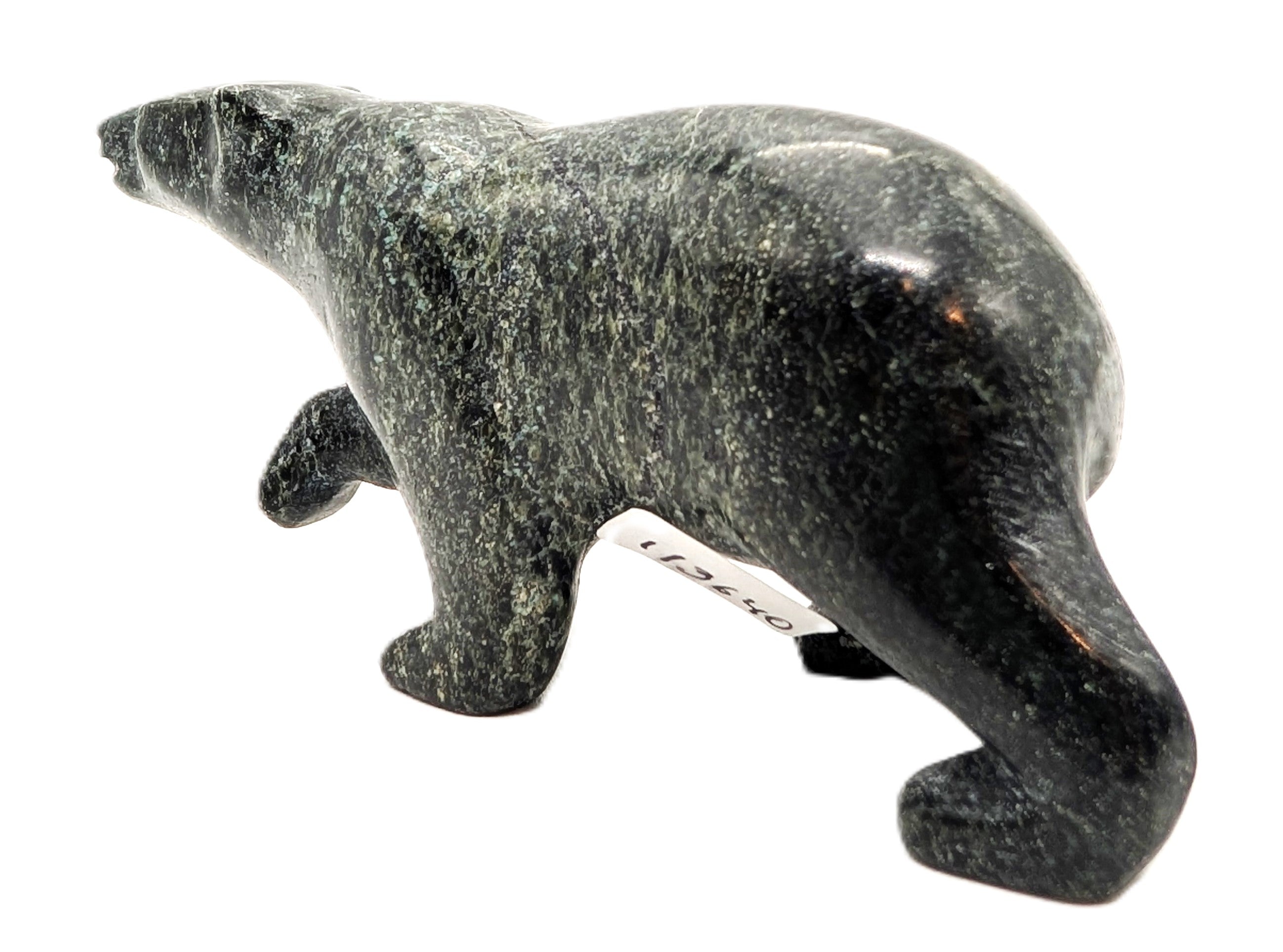 This "Walking Bear" soapstone carving was created by Inuk artist Tim Pee in Cape Dorset, Nunavut. Registration number is 113640.